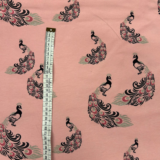 Påfugle med glimmer hale på lyserød baggrund - Bomuldsjersey