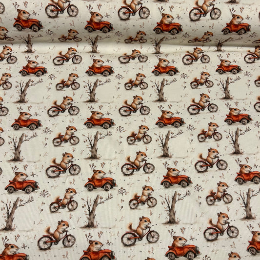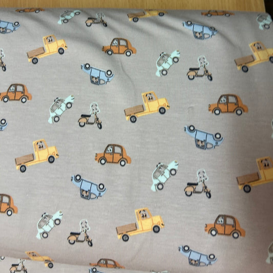 Små køretøjer på taupe/sand baggrund - Bomuldsjersey
