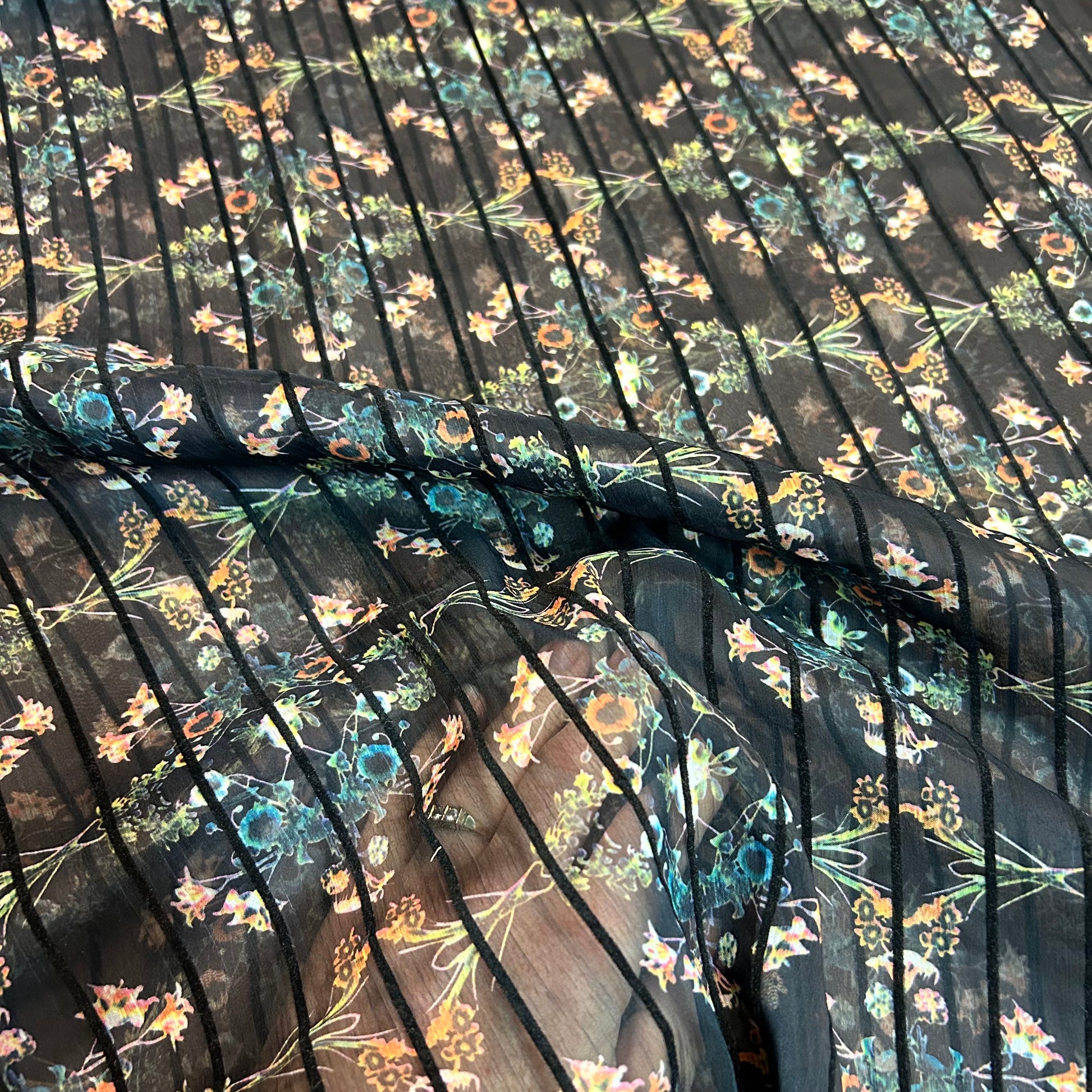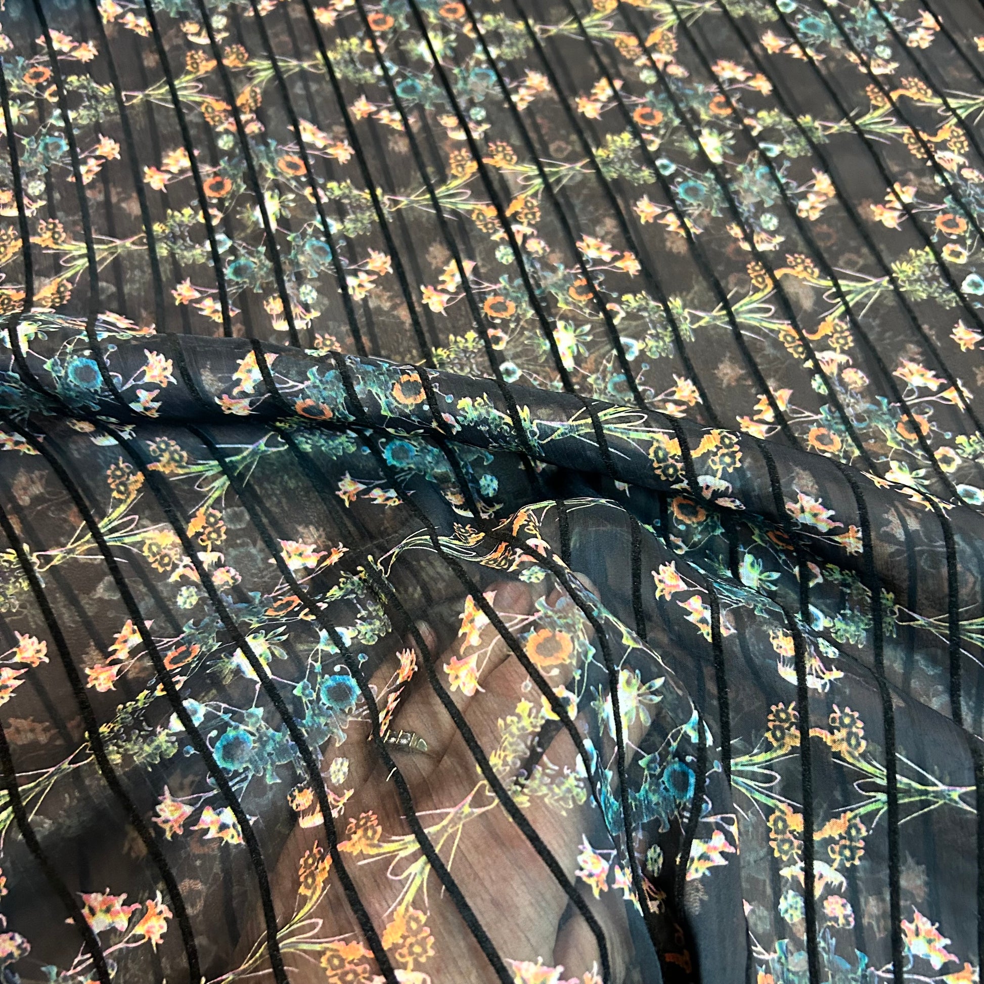 Så smukt og elegant print med små blomster og markeret sorte streger igennem på sort baggrund.
