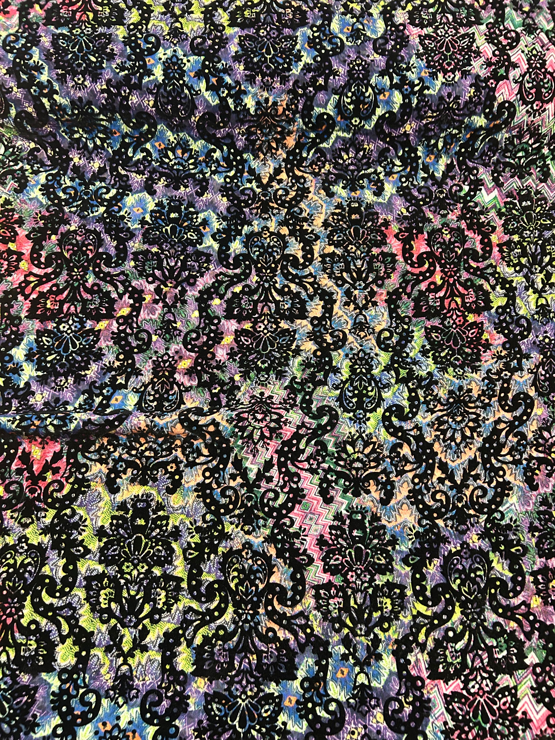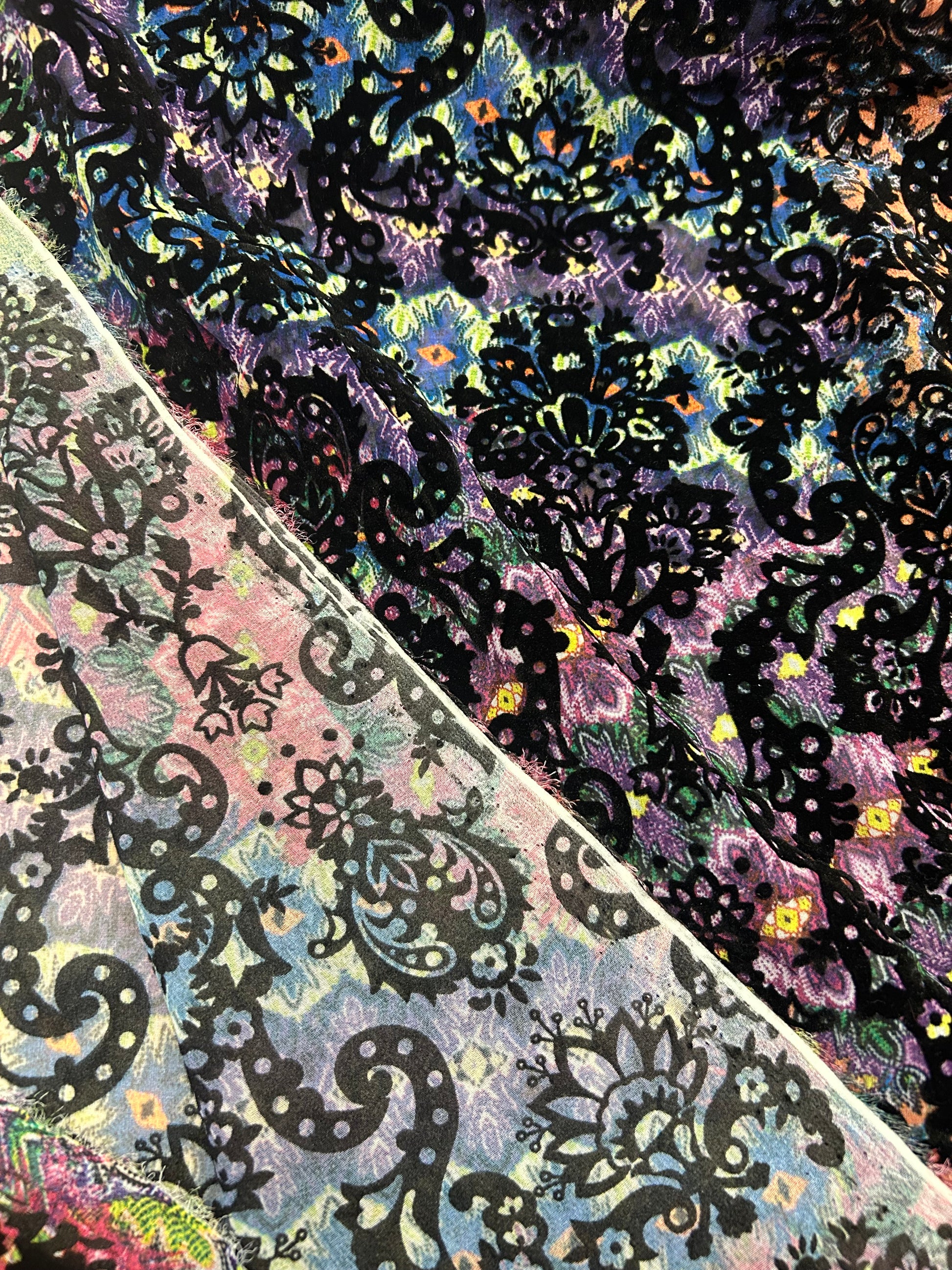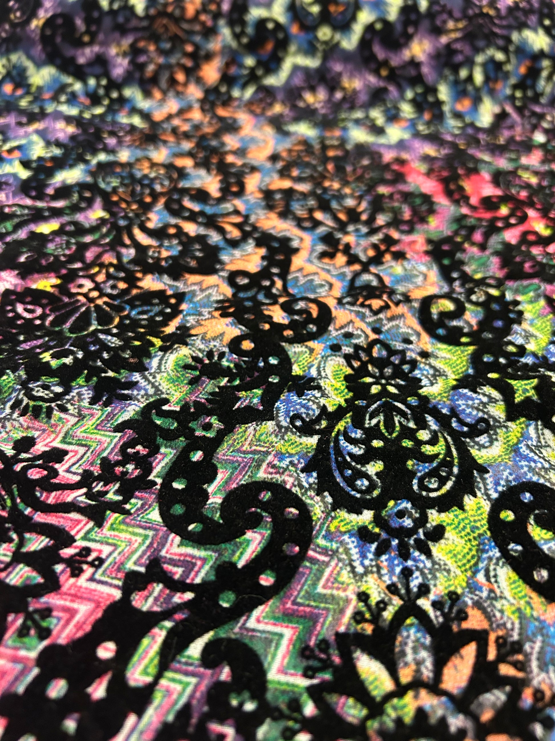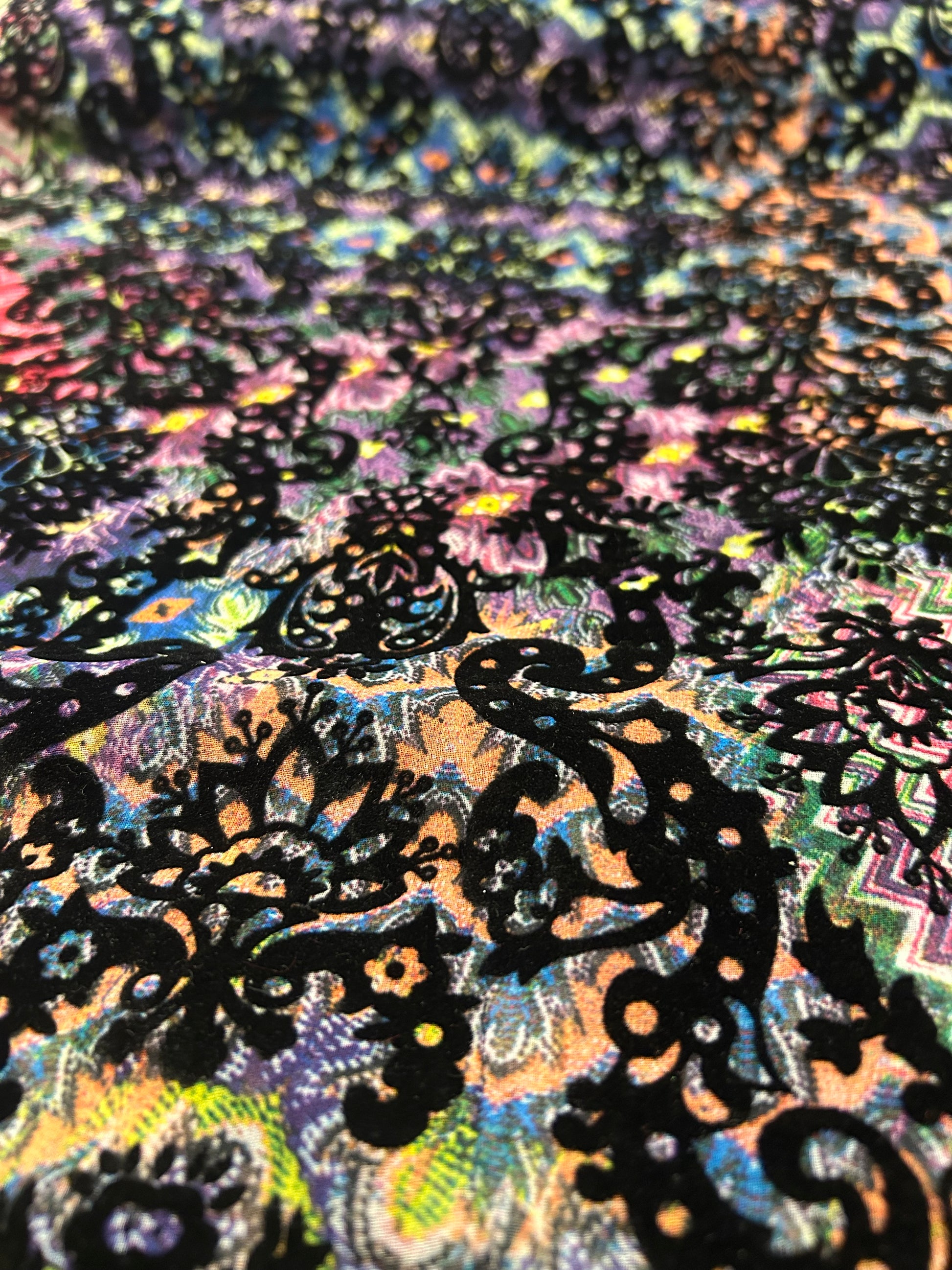 Flocktryk er en metode hvor der tilføjes en "håret" struktur på stoffet, som gør det føles som fløjl. Resultatet er dette forhøjet mønstret som er super fint og fed kontrast til den farverige baggund.