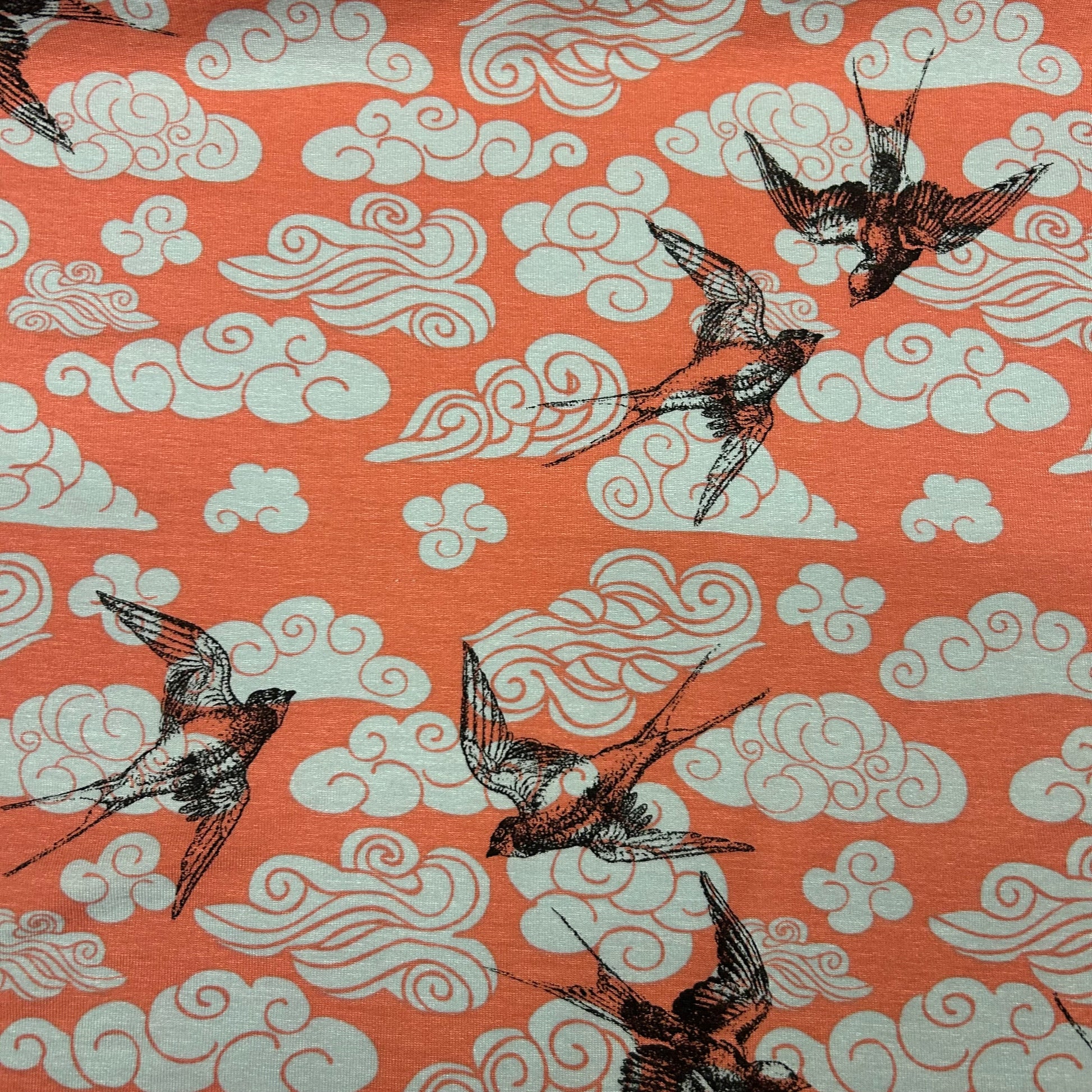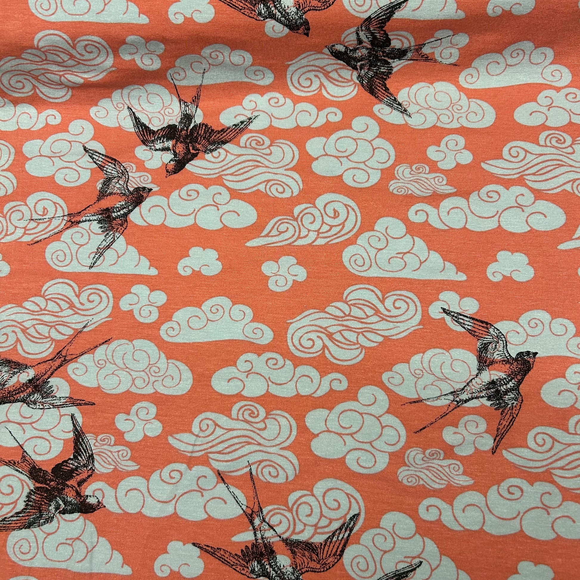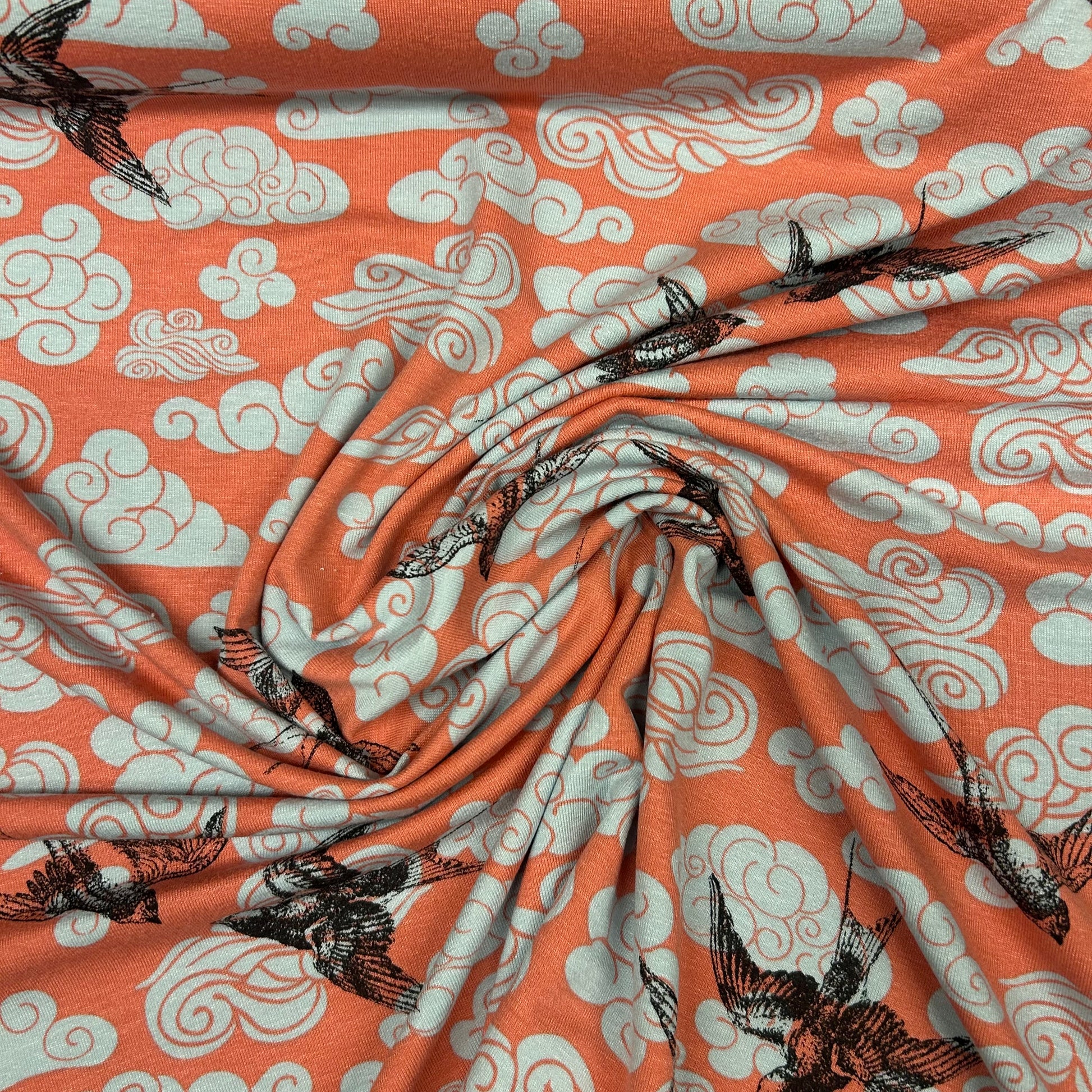 Skyer og fugle på fersken baggrund - Viskosejersey