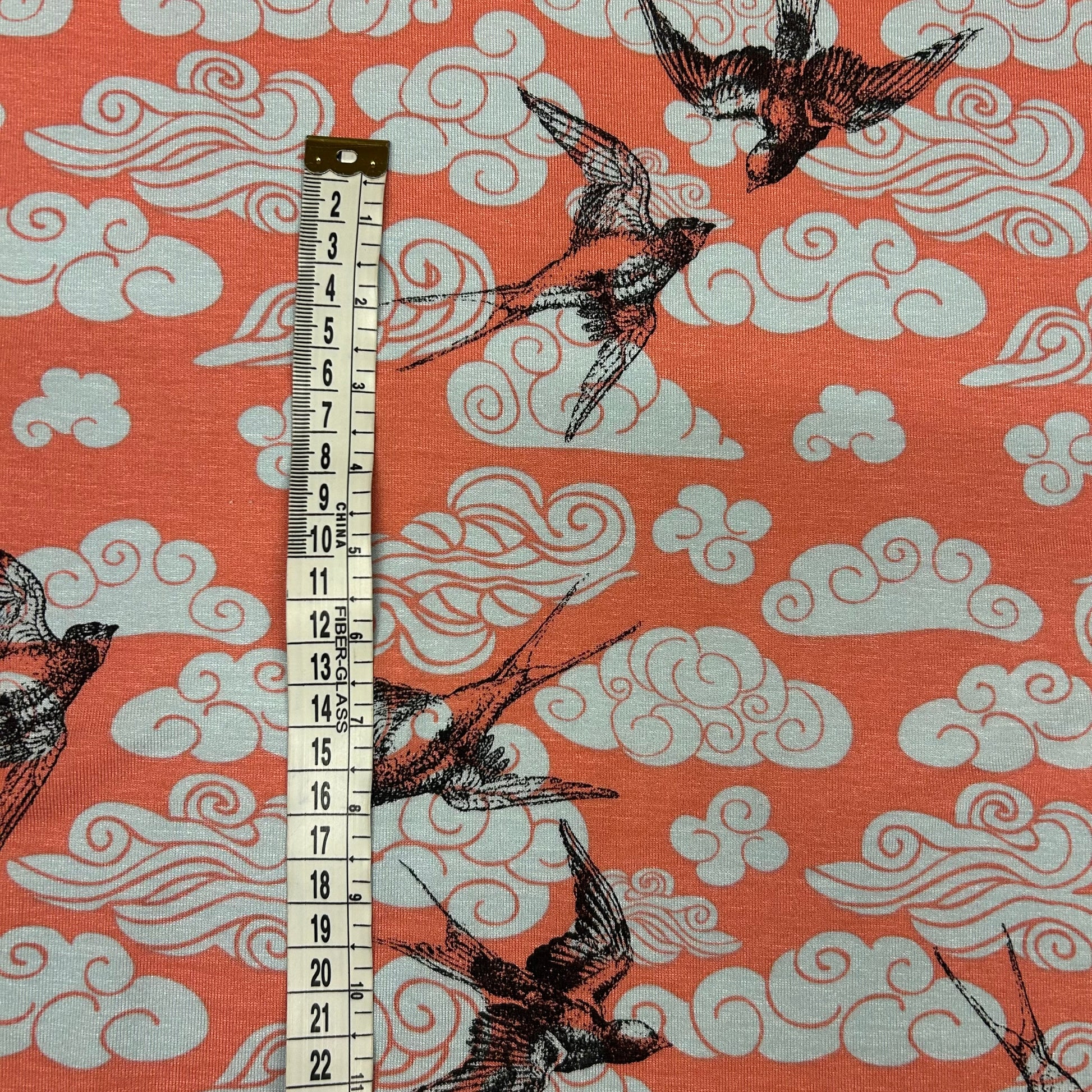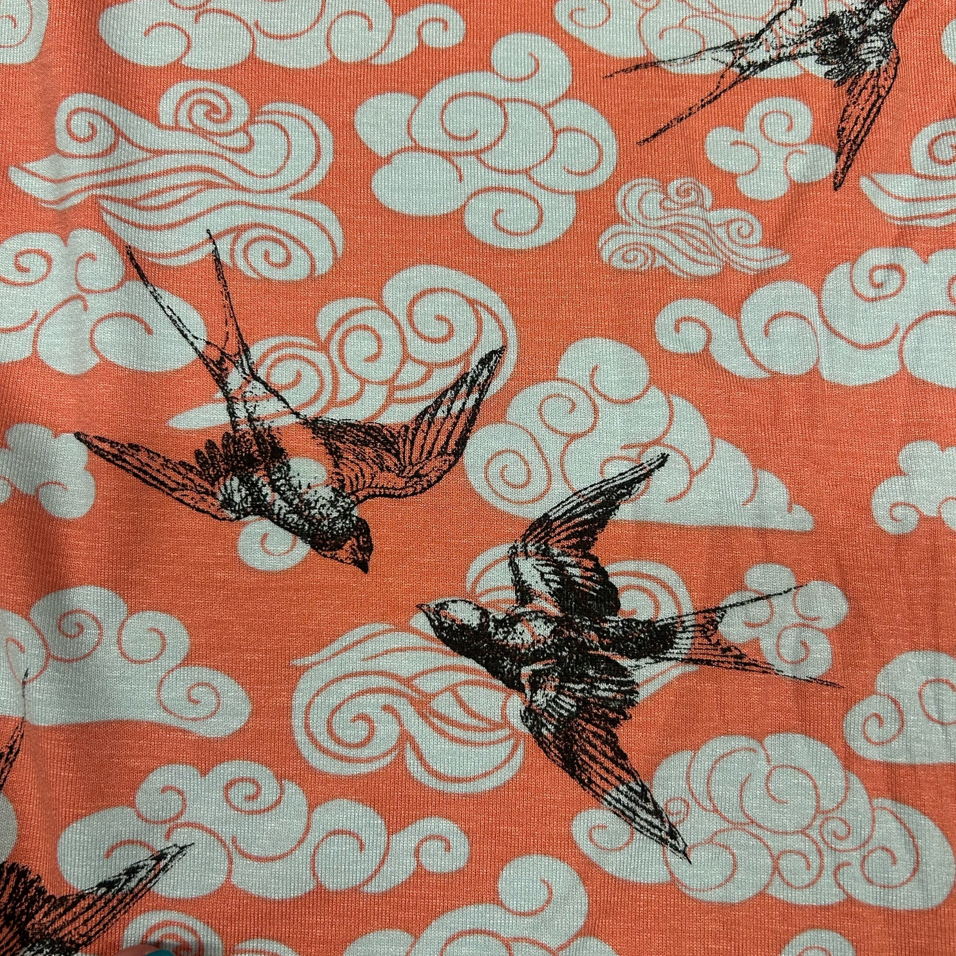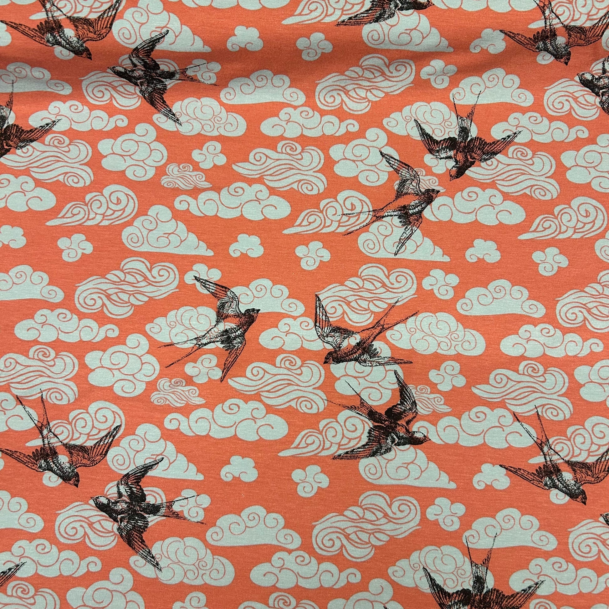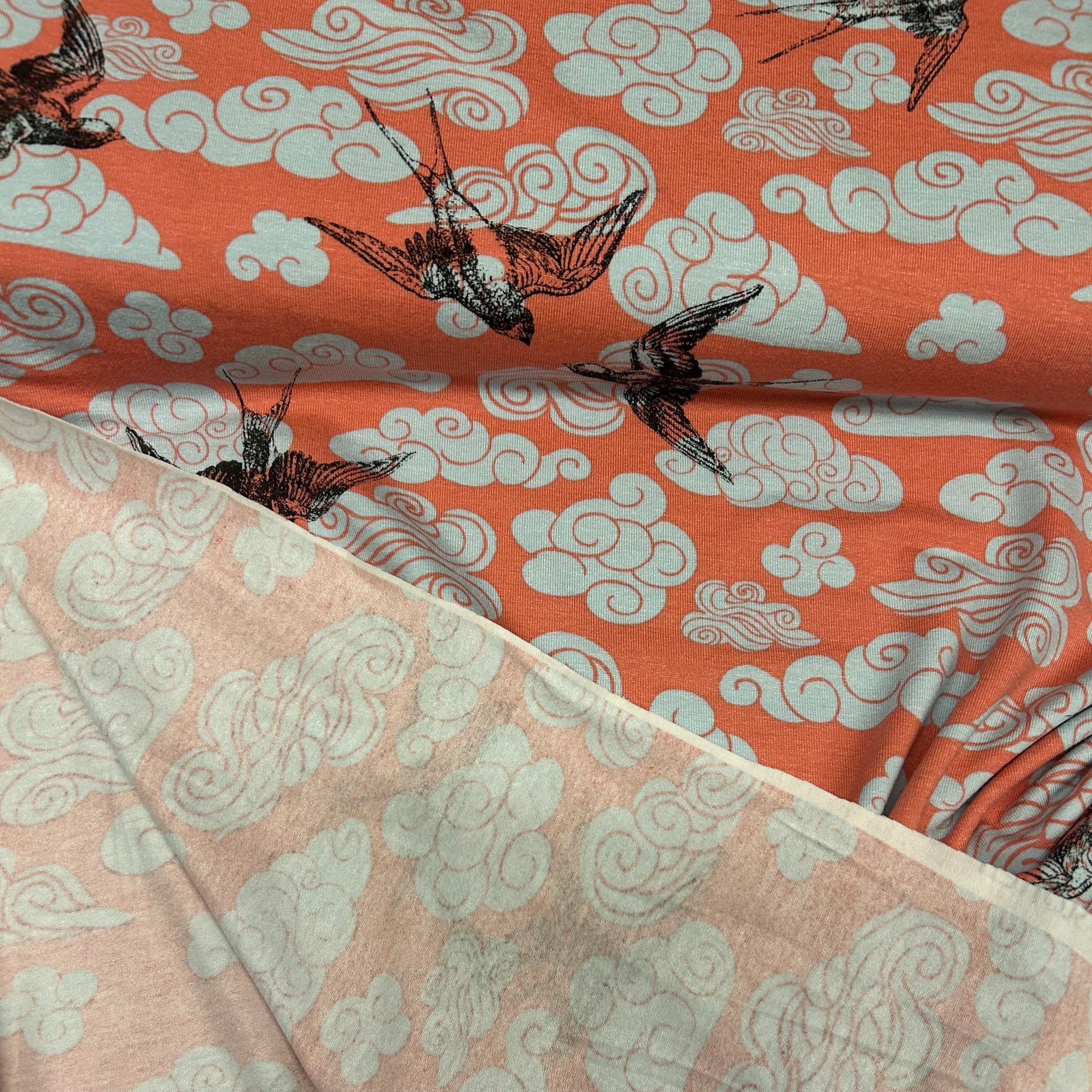 Skyer og fugle på fersken baggrund - Viskosejersey