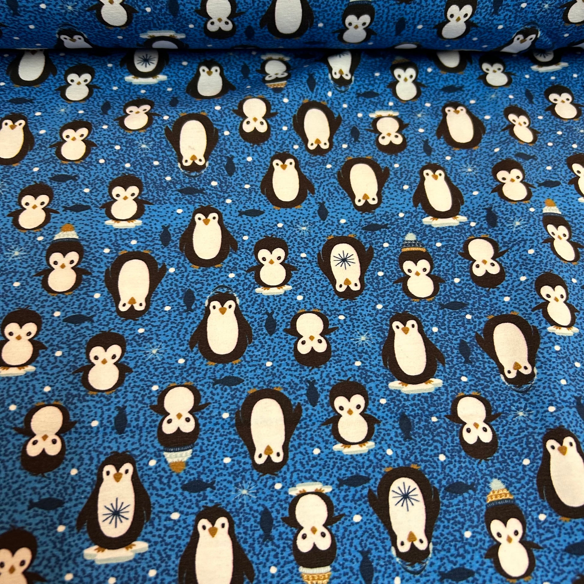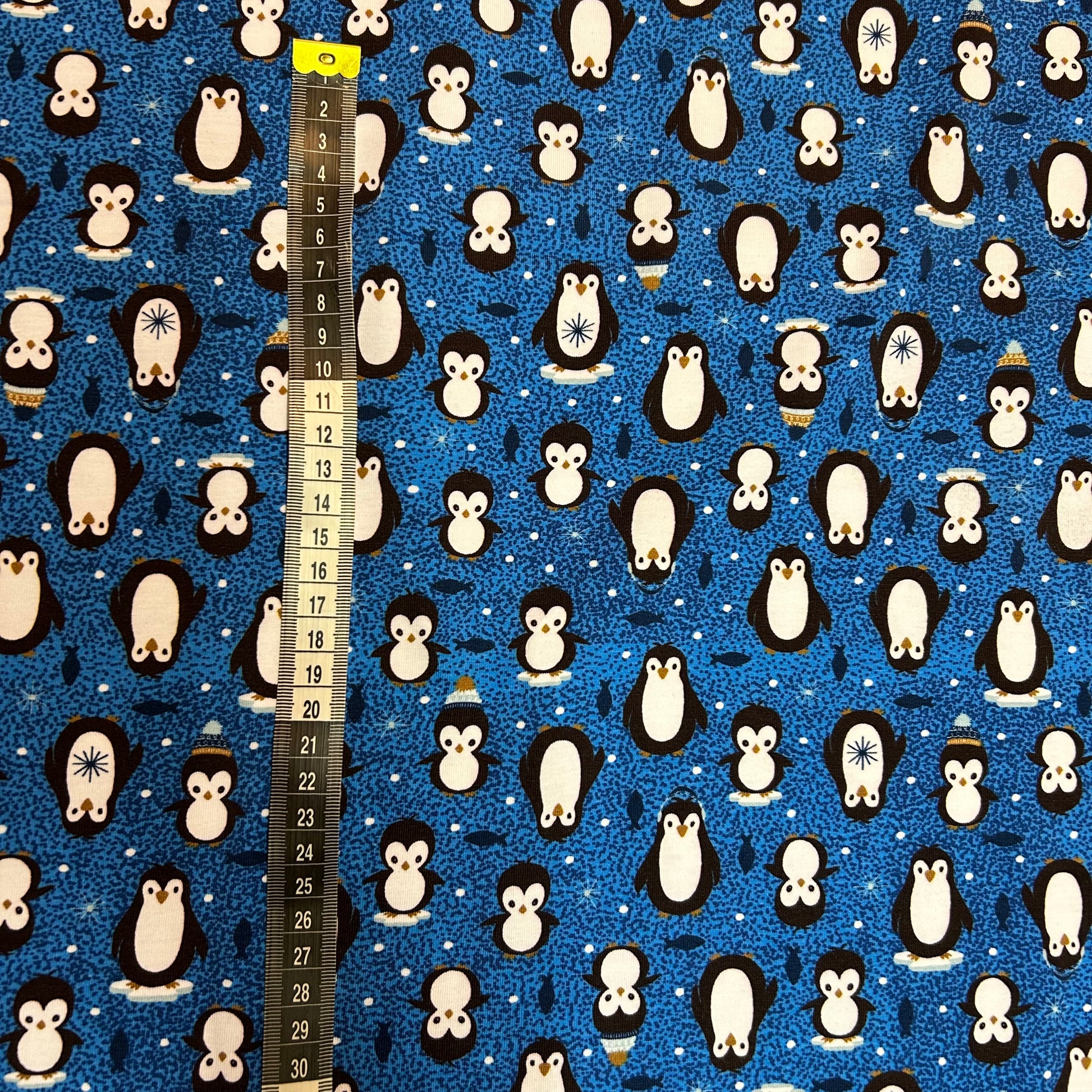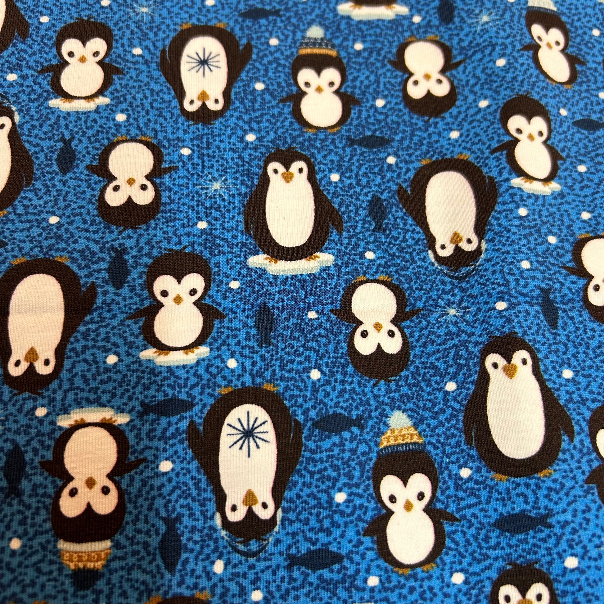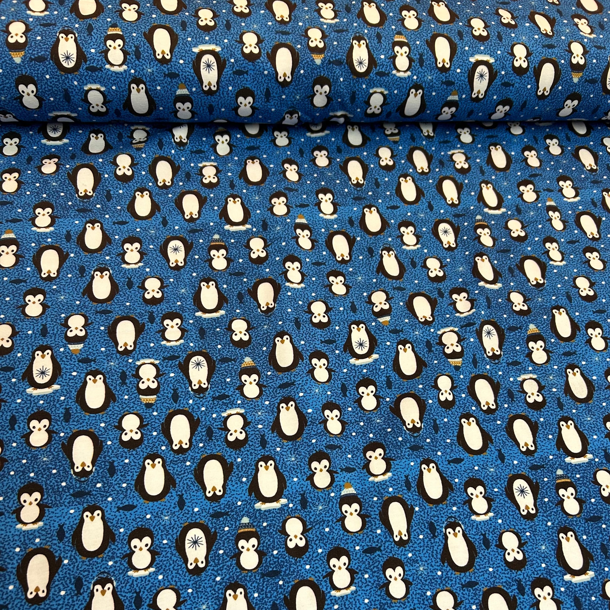 Små pingviner på blå baggrund - Bomuldsjersey